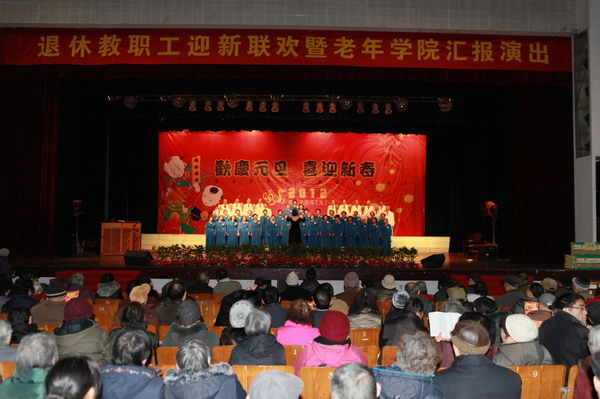 陈一星副校长首先代表学校向为筹备本次演出活动付出辛勤劳动的工作人员、参加节目表演的老同志以及有关老师表示衷心的感谢!他向老同志们简要通报了学校2011年度在各方面所取得的令人瞩目的成就,对离退休工作处以及校退教协会围绕文化建设、让老同志“老有所乐”所作出的努力给予充分肯定,并代表学校感谢全校退休教职工对学校的建设和发展所给予的关心、支持和帮助!最后祝全校离退休老同志们在新的一年里身体健康、阖家幸福、万事如意!