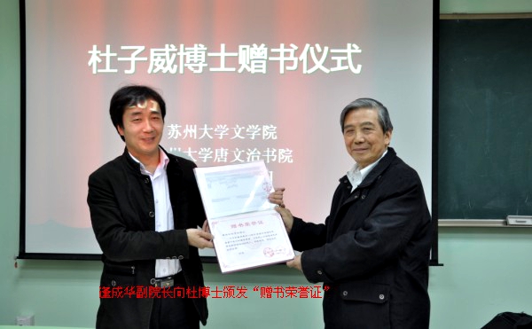 文学院院长王尧在捐赠仪式上对杜子威博士向文学院和唐文治书院捐赠图书表示感谢,对杜老的义举表示敬意!王院长介绍,杜先生所藏图书,有很多是非常珍贵稀有的版本,学院在中国传统文化工作坊设立“杜子威博士赠书阅览室”,这个事情意义重大,“更加紧密地将杜子威先生的事业与我们的学院、跨学科的研究连在了一起,对我们老师的科学研究和同学们的阅读将起到很好的作用”,也对中国传统文化工作坊的建设意义重大。王院长承诺,一定要把杜先生所赠图书收藏好、用好,“在字里行间生长出我们对中国文化的敬意,传承我们对中国文化理解,为文化中国的积淀一起努力。”副院长逢成华代表学院向杜先生颁发了“赠书荣誉证书”,并将杜先生首批520册赠书名录交由杜先生留存。同学们对杜子威博士的赠书义举致予热烈的掌声。