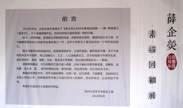 作为艺术学院关工委活动的一个有机组成部分,《薛企荧从艺60年素描回顾展》于2014年6月在独墅湖校区艺术学院601号楼展厅举行,并于6月9日下午1点30分举行了简短的画展开幕式。此次画展由艺术学院关工委主办,重现了2012年岁末在苏州美术馆举办的《薛企荧从艺60年素描回顾展――暨<素描笔记>首发式》的五十余幅素描作品。