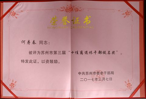 热烈祝贺我校退休干部何寿春同志荣获苏州市第三届“十佳离退休干部”提名奖