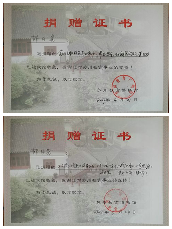 在接受了捐赠后,马守兴馆长为郁老师颁发了两张捐赠证书。 6月初,又邀请并亲自陪同郁老师参观了教育博物馆。郁老师在仔细参观了11个展厅后,激动地向马馆长表示:作为一名老教育工作者, 今后将义不容辞地支持你们!