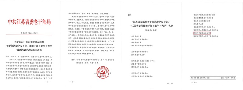 近日,经省委老干部局评审验收,我校离退休活动室获评“2022-2023年江苏省示范性老干部活动中心(室)”称号。