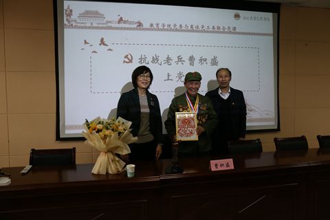 为重温百年党史,传承红色基因,将党史学习教育引向深入,4月16日,离休党工委与教育学院党委与联合举办“铭记百年党史,传承红色基因”专题党课。本次党课特邀离休党员、抗战老兵曹积盛讲述党史故事,离休党工委书记余宏明、教育学院党委书记赵阳、离休党工委在职党支部党员、教育学院教师党员、预备党员、入党积极分子聆听了党课。