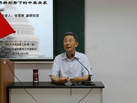 2019年6月24日,苏州大学离退休部(处)与校退教协会联合主办国际形势报告会,邀请校统战部原部长——张雪根副研究员,为我校离退休老同志作题为《世界新形势下的中美关系》的报告。报告会由退教协会理事长吴俊生主持。